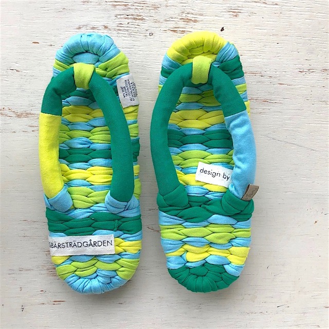 4種類のTシャツ&カットソー地をパズルのようにつなぎ合わせて作りました。 できあがったぞうりは、どことなく北欧風の色合い。アクセントのタグもそれに合わせて北欧風のものを選んで合わせてみました。 著書「もっともっとまいにち布ぞうり」29ページに掲載のデザインアレンジです。 【サイズ】 共通(M)*ノーマルサイズ(23〜24.5cmの方にお履きいただけます) 【素材】 布地=コットン・カットソー地、Tシャツ(新品を使用) *サイズの詳細・送料・プレゼントのクラフト布については、FAQのページをごらんください。