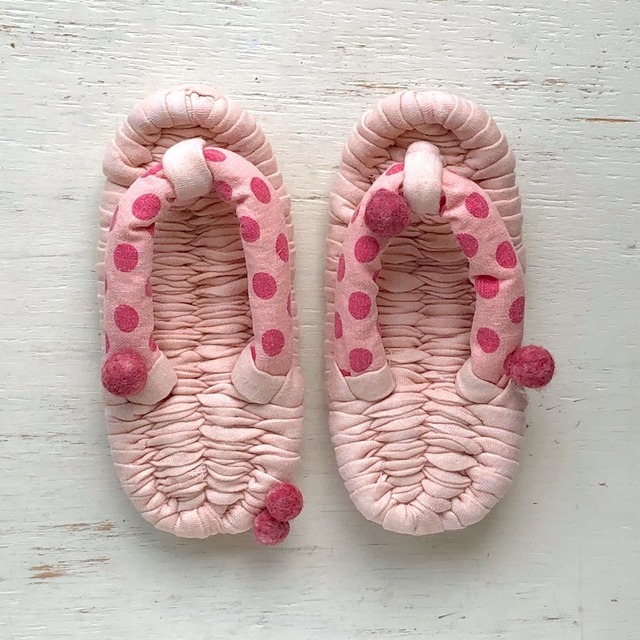 *期間限定オープン終了間近〜定価(5,060円)の7%OFF価格でご購入いただけます! 淡いピンクの本体にピンクのドット柄の鼻緒。これだけでもかわいいのですが、もっとかわいく&楽しくしたくて、ドットと同じピンクの毛糸でフェルトボールを作り、たくさんつけました。 「ほら見て! ぞうりから水玉さんが飛び出てきちゃった!」なんてね。 著書「まいにち布ぞうり」27ページに掲載のデザインです。 【サイズ】 キッズサイズ 実寸(つま先からかかとまで)19cm、幅約8cm (足サイズ16cmくらい〜からお履きいただけます) 【素材】 布地=コットン(本体はダブルガーゼ)、フェルトボール=ウール100%の毛糸 *写真では、本体土踏まずのあたりの色が違うように(濃く)見えていますが、実際はすべて変わらず同じ色です。 *サイズの詳細・送料・プレゼントのクラフト布については、FAQのページをごらんください。