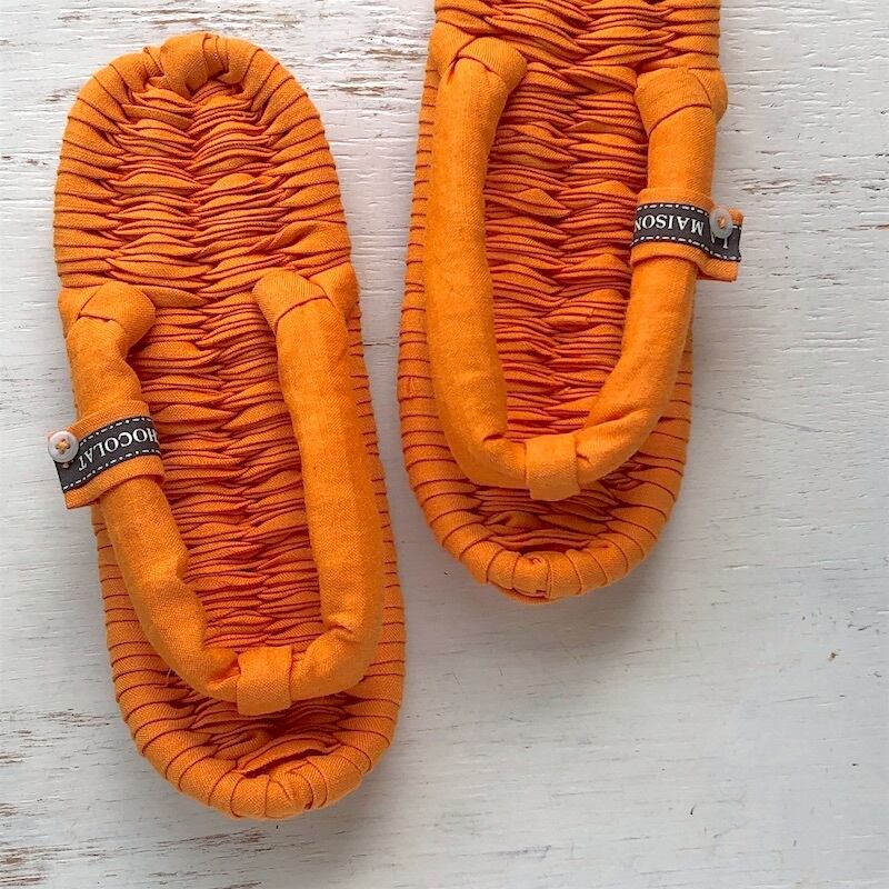 ヴィヴィッドなオレンジ色のリネンで作った、とびきり明るい雰囲気のぞうりです。