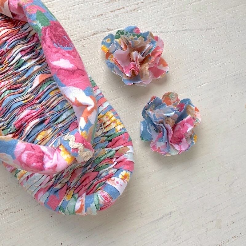 加えて、前つぼに山道テープをあしらい、同じ布でプチコサージュを作ってデザインのアクセントにしました。
