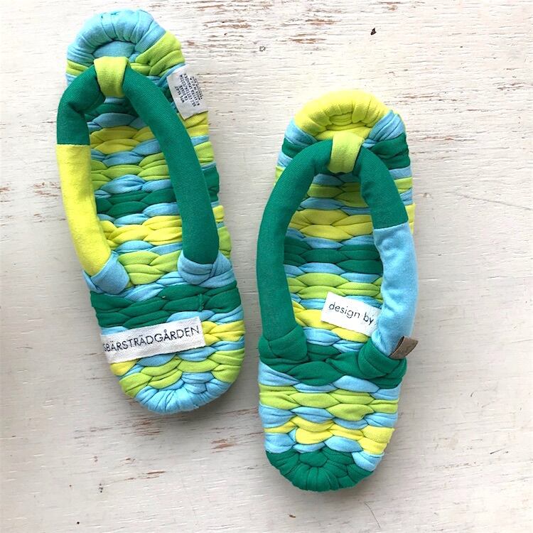 できあがったぞうりは、どことなく北欧風の色合い。アクセントのタグもそれに合わせて北欧風のものを選んで合わせてみました。