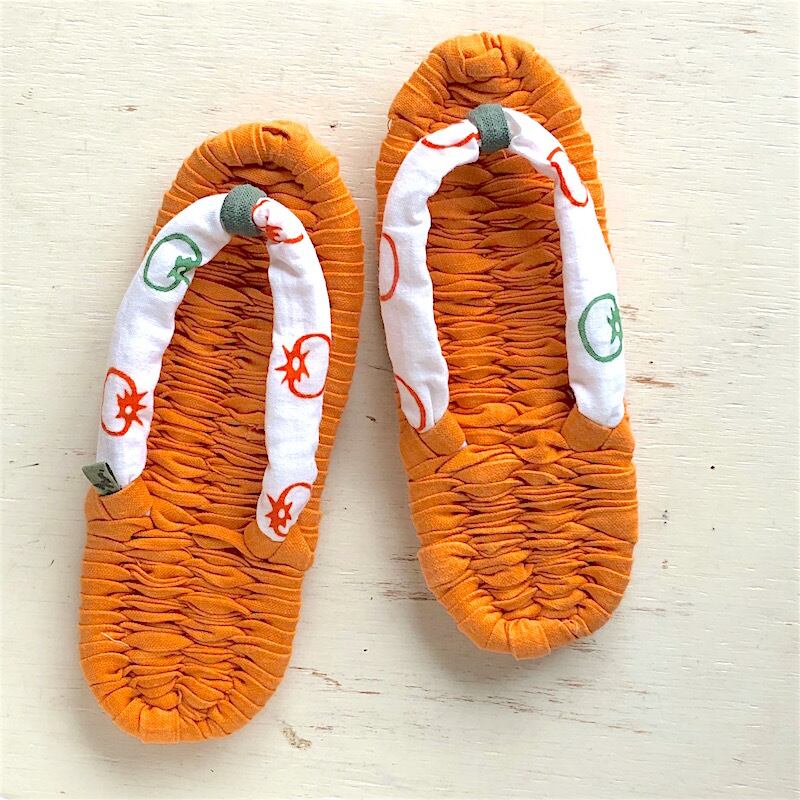 肌ざわりのいい和の木綿布を本体に使い、鼻緒だけ手ぬぐいの柄を生かしてアクセントをつけました。